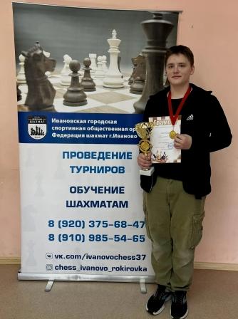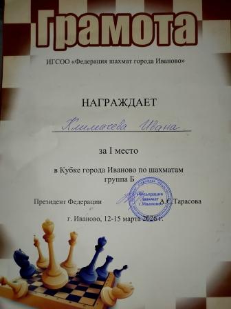 12-15.03.2026 г. в Спортивно-технической школе г. Иваново на ул. Красных Зорь, д.1 состоялся Кубок города Иваново по шахматам. Ученик нашей воскресной школы храма во имя иконы Божией Матери «Прибавление ума» Иван Климычев принял активное участие в данном мероприятии и занял первое место в группе Б. О чем был награжден Грамотой от ИГСОО «Федерация шахмат города Иваново». Поздравляем с этим достижением и желаем новых побед!